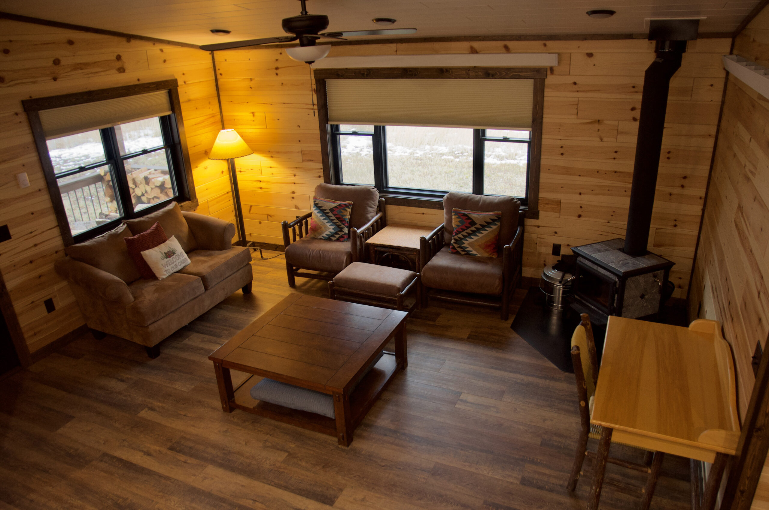 The cabin features two bedrooms, one full bathroom, a large, well-equipped kitchen, and a warm living area centered around a wood stove. A washer and dryer make longer stays easy, while wide views of Tom Miner Basin and direct access to our cross-country ski trails invite you outside.